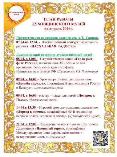 документальный материал о воинах, освобождавших наш район. Все это впоследствии было объединено в специальную экспозицию о Великой Отечественной войне. В 1991 году музею был присвоен статус государственного. Его Фонды к этому времени пополнились коллекциями предметов, принадлежавших знаменитым людям земли духовщинской: писателю В.И. Ардаматскому, педагогу-новатору С.Т. Шацкому, путешественнику исследователю Центральной Азии П.К. Козлову и многим другим нашим землякам. В 2000 году в Духовщинском районе была создана единая музейная система, объединившая Духовщинский музей и Пречистенскую картинную галерею. Экспозиции историко-художественного музея рассказывают об истории Духовщины, быте крестьян, Великой Отечественной войне (о начале ВОВ и оккупации Духовщинского район, о партизанском движении нашего района, о сожжённых деревнях духовщинской земли, об освобождении города и района от фашистских захватчиков и т.д.), знаменитых уроженцах Духовщинской земли (Г.А.Потемкине, С.Н. Глинке, Ф.Н. Глинке, Я.М. Колотыркине, А.Т. Сашине др.).