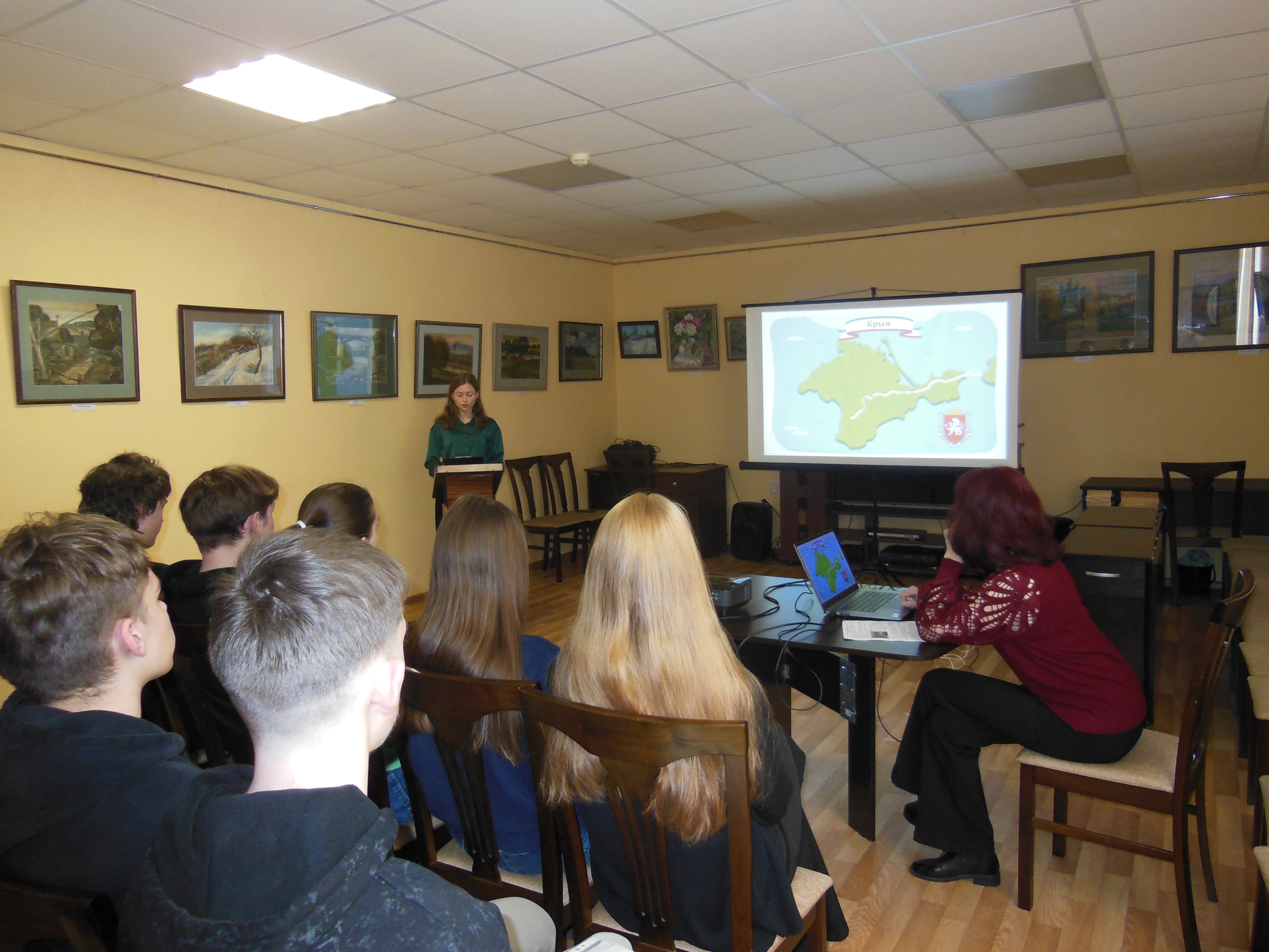 18 марта в музее прошёл урок истории для школьников "Крымская весна". В ходе урока учащиеся 10-го класса Духовщинской средней школы вспомнили об истории Крыма, его роли в развитии нашей страны, о событиях, приведших к воссоединению Крыма и Севастополя с Россией в 2014 году. Ребята ознакомились с современным состоянием полуострова Крым, его нынешним развитием и дальнейшими перспективами.